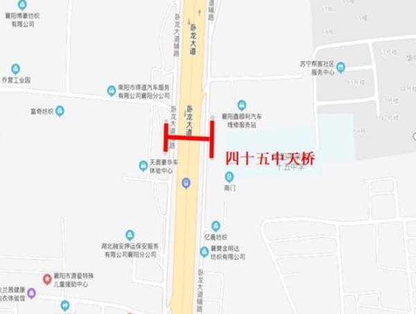 17.四十五中天橋:位于臥龍大道四十五中門口,天橋長 59.3米,寬 4.9 米。因該天橋位于襄陽市第四十五中門口,本著“好記易找”原則,為突出地名的指位性,方便市民找尋,故命名為四十五中天橋。