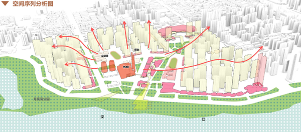 塑造沿江的城市濱江綠帶和垂江的江景景觀軸,共同形成“T"字形的景觀主軸。以垂江景觀軸為主要空間骨架,向兩側(cè)延伸智慧住區(qū)、工業(yè)文化中心、公園學(xué)校、潮玩街區(qū)、商業(yè)樂(lè)活街區(qū)等功能。