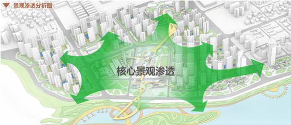 強(qiáng)化垂江“T”軸的景觀功能,形成除濱江景觀以外,從核心區(qū)向多個(gè)方向、多個(gè)層次的景觀滲透。