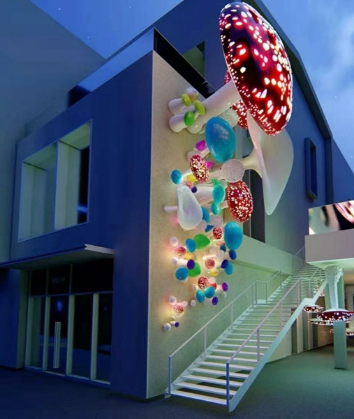 最終我將這些色彩鮮艷的植物設(shè)計(jì)到一個(gè)狹窄樓梯通道的側(cè)墻上與天花板下,那并不是一個(gè)高開放度的空間,是你遛彎時(shí)偶然遭遇的一個(gè)小空間,如果人們?cè)谶@樣一個(gè)狹小的空間偶遇這樣大小的植物從墻側(cè)面上由高到低地生長(zhǎng)出來(lái),那么,在這里向上向下行走的時(shí)候會(huì)形成一種奇妙的視覺(jué)沉浸感。由天花板上垂落的蘑菇的尺度剛剛好高于普通人的身高尺度,在屋檐有光的地方形成一種非比尋常的壓力,是人們對(duì)植物的一種前所未有的觀看角度。
