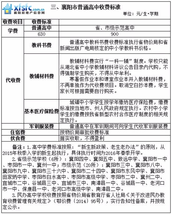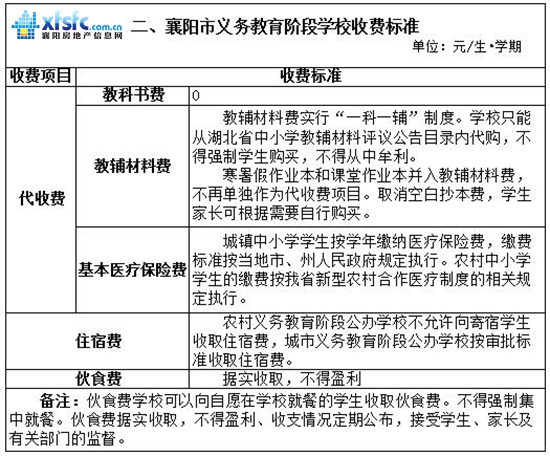 2017年秋季學(xué)期開學(xué)臨近,為進一步規(guī)范教育收費行為,切實維護學(xué)校和學(xué)生的合法權(quán)益,8月14日,市教育局、市物價局、市財政局聯(lián)合下發(fā)《關(guān)于2017年秋季幼兒園、普通中小學(xué)收費標(biāo)準(zhǔn)的通知》。根據(jù)規(guī)定,今年秋季學(xué)期,市區(qū)公辦幼兒園收費標(biāo)準(zhǔn)按等級從每月200元到450元不等,保教費按月或按學(xué)期收取,不得跨學(xué)期預(yù)收;義務(wù)教育階段一律免收教科書費,教輔材料費實行“一科一輔”制度,農(nóng)村義務(wù)教育階段公辦學(xué)校不允許向寄宿學(xué)生收取住宿費;高中階段,襄陽四中、襄陽五中、致遠中學(xué)、襄陽一中、棗陽一中等26所省、市級示范高中為900元/學(xué)期/生,其他學(xué)校均為630元/學(xué)期/生。義務(wù)教育階段、高中階段學(xué)生住宿費按有關(guān)文件執(zhí)行。