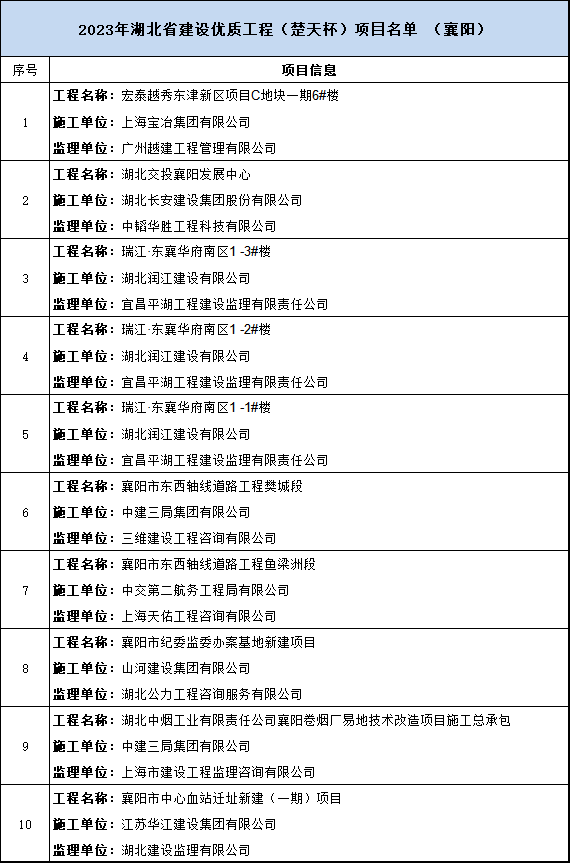 經(jīng)省建設(shè)工程質(zhì)量安全協(xié)會組織評選,我市宏泰越秀東津新區(qū)項(xiàng)目C地塊一期6#樓、湖北交投襄陽發(fā)展中心等10項(xiàng)工程榮獲2023年湖北省建設(shè)優(yōu)質(zhì)工程(楚天杯)。近日,省住建廳發(fā)文對獲獎(jiǎng)工程的承建單位和監(jiān)理單位給予了通報(bào)。