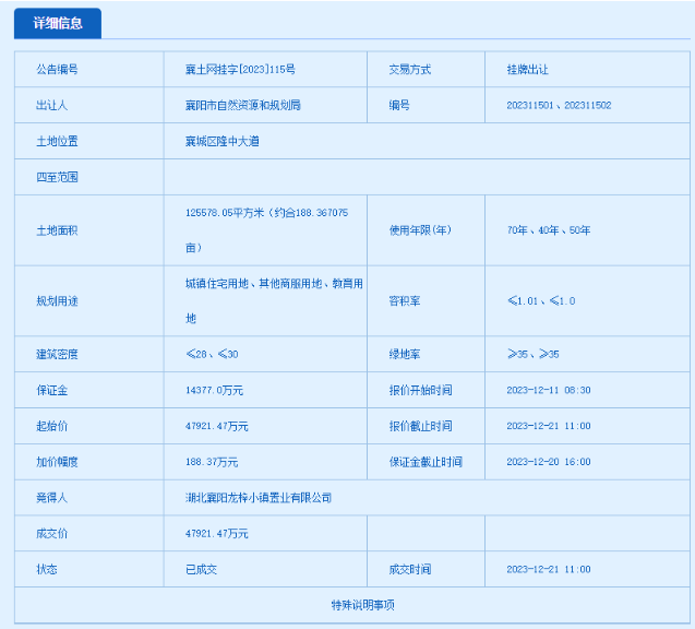 襄陽市國土資源網(wǎng)上交易系統(tǒng) 襄城區(qū)成交了一宗地塊 由湖北襄陽龍梓小鎮(zhèn)置業(yè)有限公司摘得 成交總價超4.79億元! 總面積約188.37畝! 此前湖北襄陽龍梓小鎮(zhèn)置業(yè) 有限公司在襄城區(qū)開發(fā)有 湖北文旅·耕讀小鎮(zhèn)項目 此次新地塊位置緊鄰耕讀小鎮(zhèn)