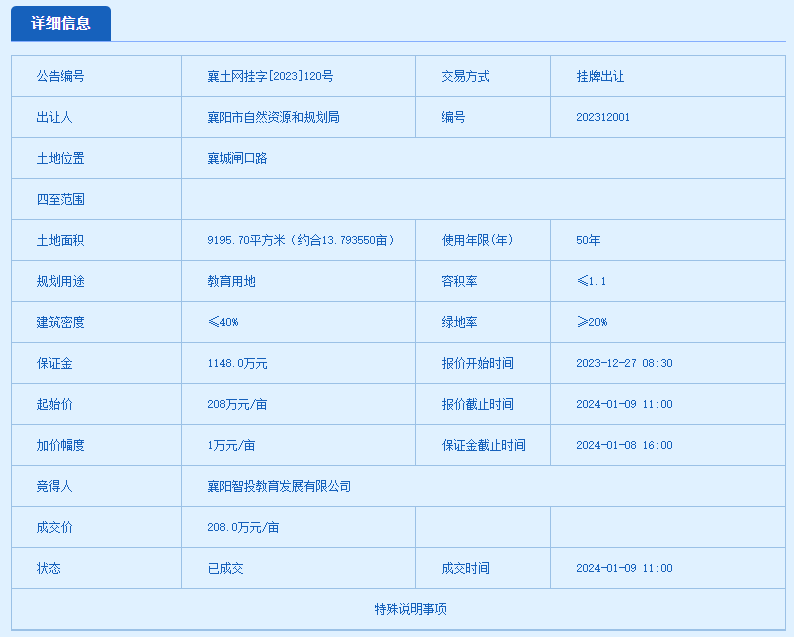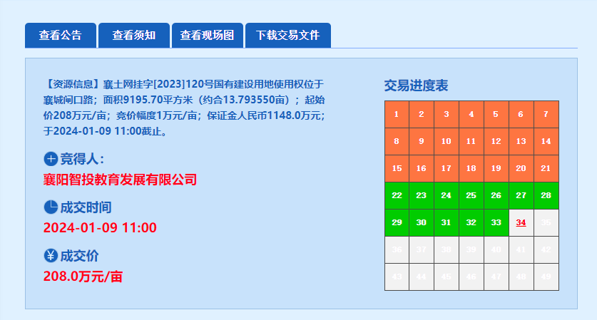 襄城龐公片區(qū)再成交一宗教育用地 由“襄陽智投教育發(fā)展有限公司”摘得 成交總價(jià)約0.29億元! 總面積約13.79畝!