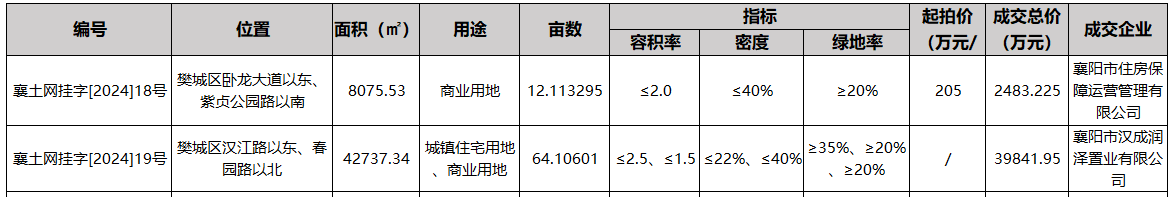 7月20日,襄土網(wǎng)掛字[2024]19號經(jīng)過成交——中止——再成交,以約3.98億元被襄陽市漢成潤澤置業(yè)有限公司拍下,溢價率約17.82%。