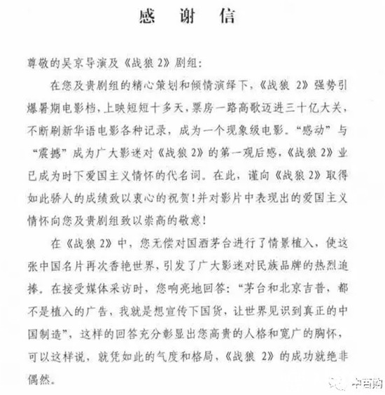在很多人看來茅臺之所以如此水漲船高,銷量和股價大漲,是因為《戰(zhàn)狼2》的火爆帶動了茅臺的火爆。為此,茅臺高層還向導演吳京和《戰(zhàn)狼2》劇組表達了感謝!