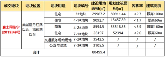 該地塊面積為80499.4平方米(約合120.749100畝);起始價94184.29萬元;競價幅度120.75萬元;保證金人民幣56510.579萬元;最終成交價為94184.29萬元,約合780萬/畝,綜合樓面價為5168元/㎡。根據(jù)襄陽市國土資源網(wǎng)上交易系統(tǒng)顯示,該地塊共分為6宗建設(shè)用地,土地性質(zhì)分別為住宅、住宅、商服、住宅、交通服務(wù)場站用地、公園與綠地;6宗地中最低容積率為小于1.7,最大容積率為小于3.9;最大綠地率大于35%。其中4-2地塊性質(zhì)為商業(yè)商務(wù)用地,規(guī)劃條件限高160米,預(yù)計將建設(shè)超高層商業(yè)中心,將為進(jìn)一步完善樊城沿江城市天際線,為江景增加一道靚麗的風(fēng)采。