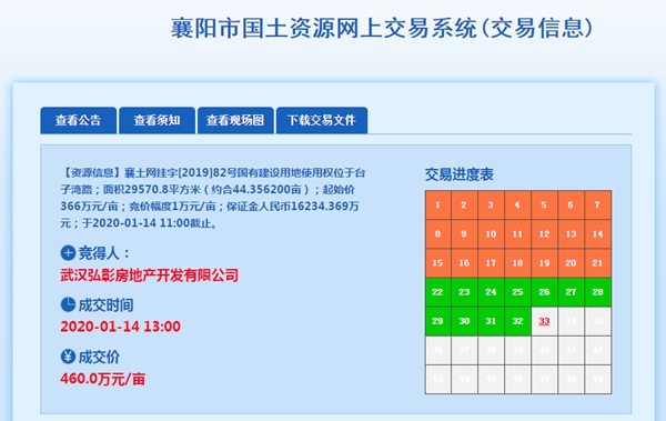 該地塊起始價(jià)為366萬/畝,最終成交價(jià)為460萬/畝,成交樓面地價(jià)約為3450元/平方米,溢價(jià)率為25.68%。襄土網(wǎng)掛字[2019]82號國有建設(shè)用地使用權(quán)最終競得人為武漢弘彰房地產(chǎn)開發(fā)有限公司,背后是知名房企弘陽地產(chǎn)。