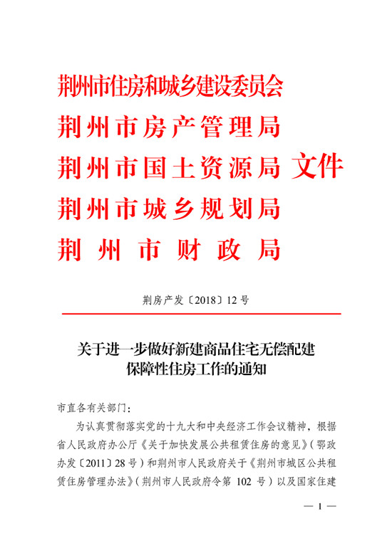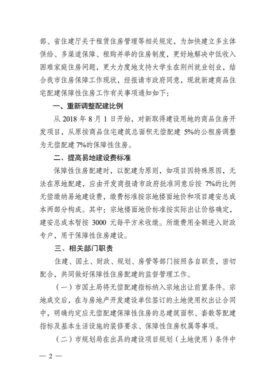 近日,荊州市住建委、市房管局等五部門聯(lián)合發(fā)布《通知》:今后,荊州新取得建設(shè)用地的商品房住房開發(fā)項目,從原按商品住宅建筑總面積無償配建5%的公租房,調(diào)整為無償配建7%的保障性住房。