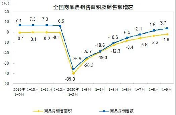 國(guó)家統(tǒng)計(jì)局今日(10月19日)公布的《2020年1-9月份全國(guó)房地產(chǎn)開發(fā)投資和銷售情況》顯示,1-9月份全國(guó)房地產(chǎn)開發(fā)投資103484億元,同比增長(zhǎng)5.6%,增速比1-8月份提高1.0個(gè)百分點(diǎn);商品房銷售面積117073萬(wàn)平方米,同比下降1.8%,降幅比1-8月份收窄1.5個(gè)百分點(diǎn);商品房銷售額115647億元,增長(zhǎng)3.7%,增速提高2.1個(gè)百分點(diǎn)。