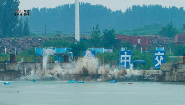 此外,為落實(shí)好爆破作業(yè)環(huán)保工作,爆破前小藥量微爆提前驅(qū)散魚群,并在外圍設(shè)置了氣泡帷幕,盡最大限度地保護(hù)了漢江生態(tài)環(huán)境和周邊建筑物安全。爆破時(shí),采用了電子雷管毫秒微差延時(shí)起爆技術(shù),通過控制最大單響藥量,最大限度地降低爆破瞬間能量過大帶來的地震效應(yīng),減少水中沖擊波的影響范圍。